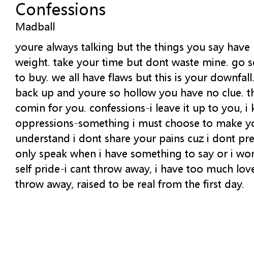 youre always talking but the things you say have no meaning, they carry no weight. take your time but dont waste mine. go sell your stories im not looking to buy. we all have flaws but this is your downfall. talkin a game you cant even back up and youre so hollow you have no clue. theres repercussions and theyre comin for you. confessions-i leave it up to you, i know where i stand. oppressions-something i must choose to make you understand. to make you understand i dont share your pains cuz i dont preach about pointless things. i only speak when i have something to say or i wont fake moves disgrace my name. self pride-i cant throw away, i have too much love for family. self pride-i wont throw away, raised to be real from the first day. |