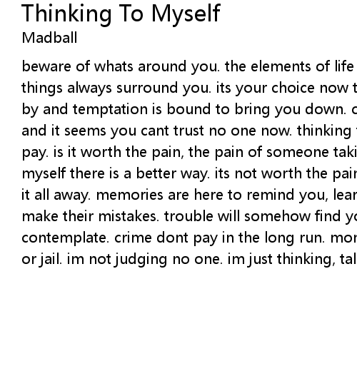 beware of whats around you. the elements of life will sometimes take you in. bad things always surround you. its your choice now to think. crime is easy to come by and temptation is bound to bring you down. corruption distorts your judgement and it seems you cant trust no one now. thinking to myself theres a price to pay. is it worth the pain, the pain of someone taking your life away? saying to myself there is a better way. its not worth the pain, the pain of someone taking it all away. memories are here to remind you, learn from your brothers. dont make their mistakes. trouble will somehow find you, its your choice to contemplate. crime dont pay in the long run. money aint worth the risk of death or jail. im not judging no one. im just thinking, talkin to myself. |