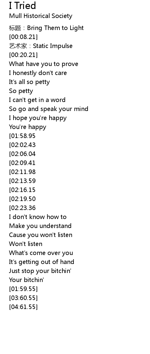 | [01:21.79][02:23.36][03:45.57] | Remember I tried |