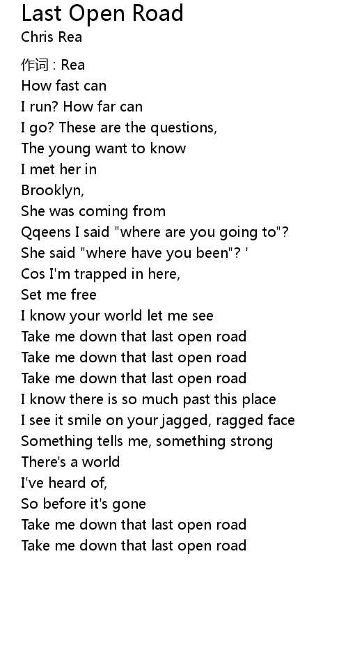 | Take me down that last open road | |