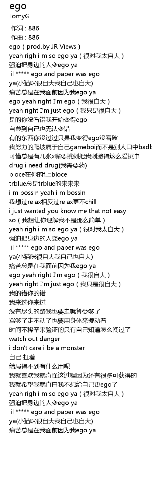 | [02:51.910] | lil ***** ego and paper was ego ya(小猫咪很自大我自己也自大) |