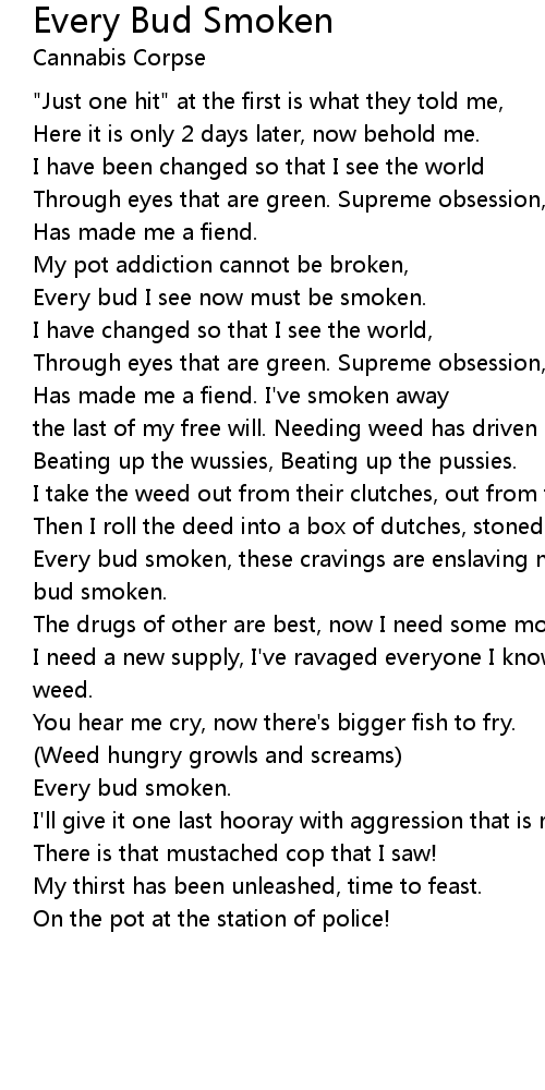 Every bud smoken, these cravings are enslaving me, weed frenzied reality, Every bud smoken. |