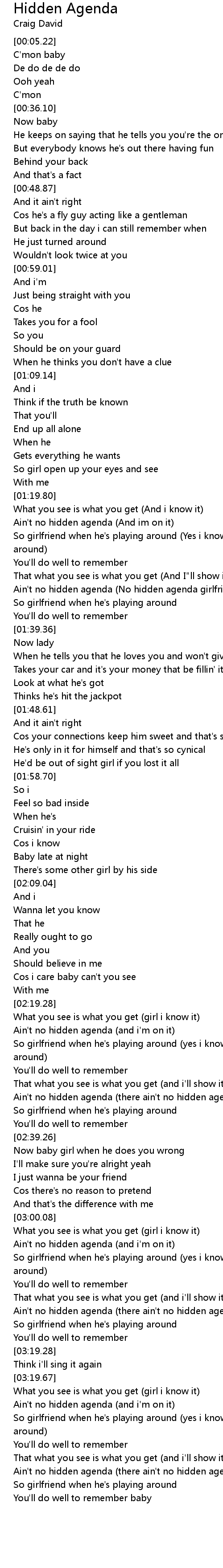 Ain't no hidden agenda (No hidden agenda girlfriend) |