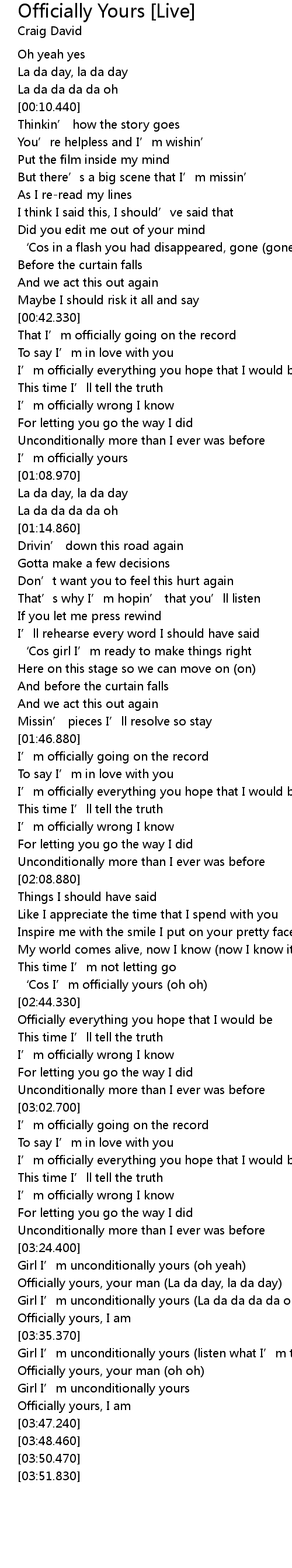 | [02:39.380] | ' Cos I' m officially yours oh oh |