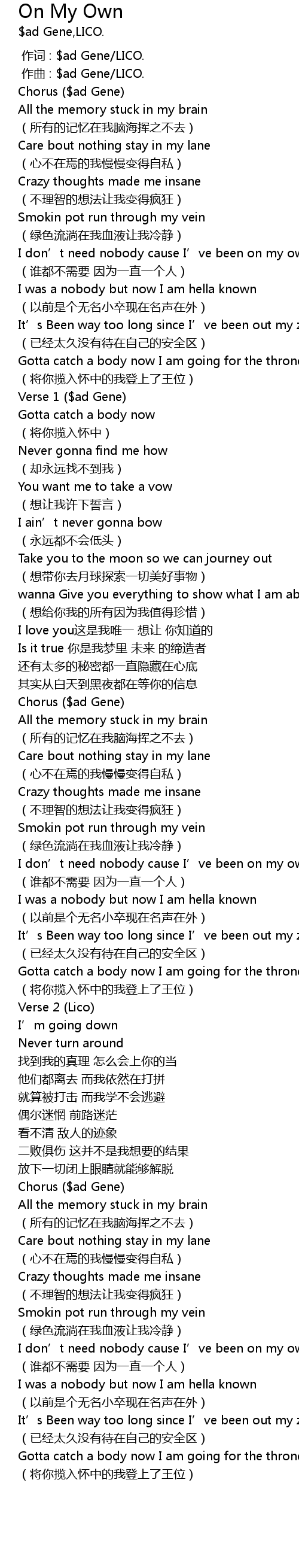 | [00:35.948] | I don' t need nobody cause I' ve been on my own |