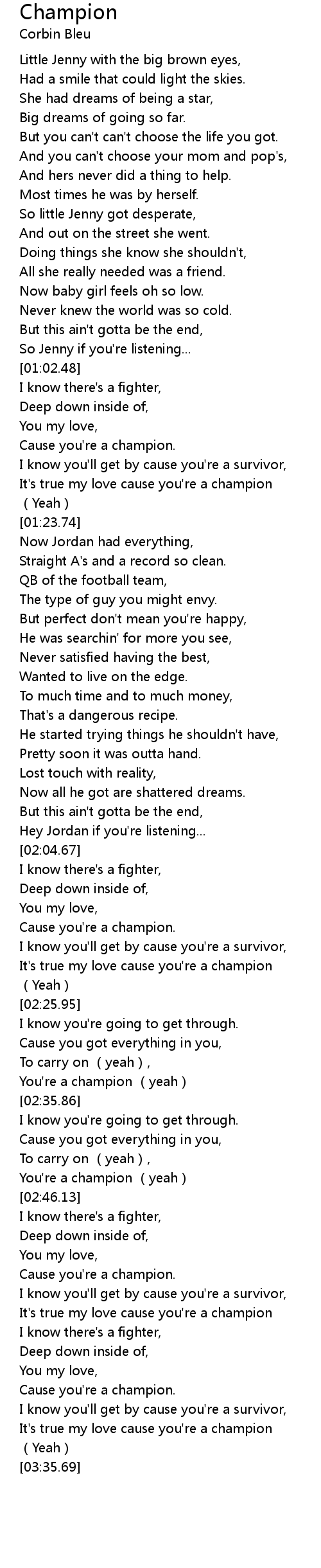 | [03:22.62] | It' s true my love cause you' re a champion |