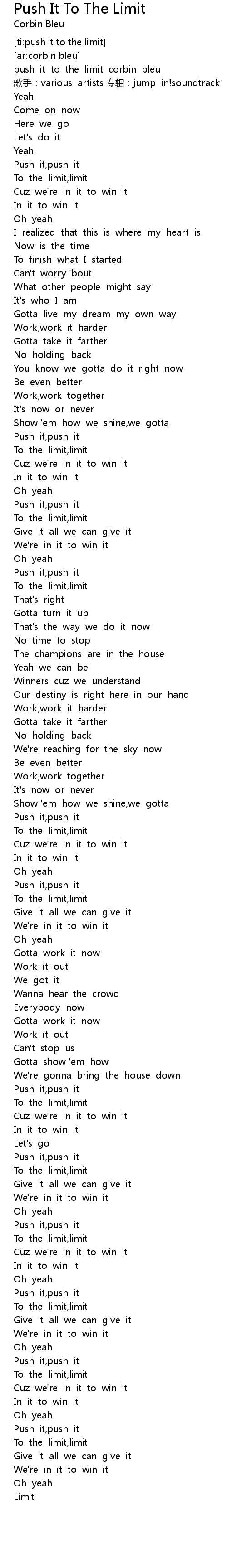| [00:00.773]push it to the limit corbin bleu] | dǎ yìn cǐ yè |