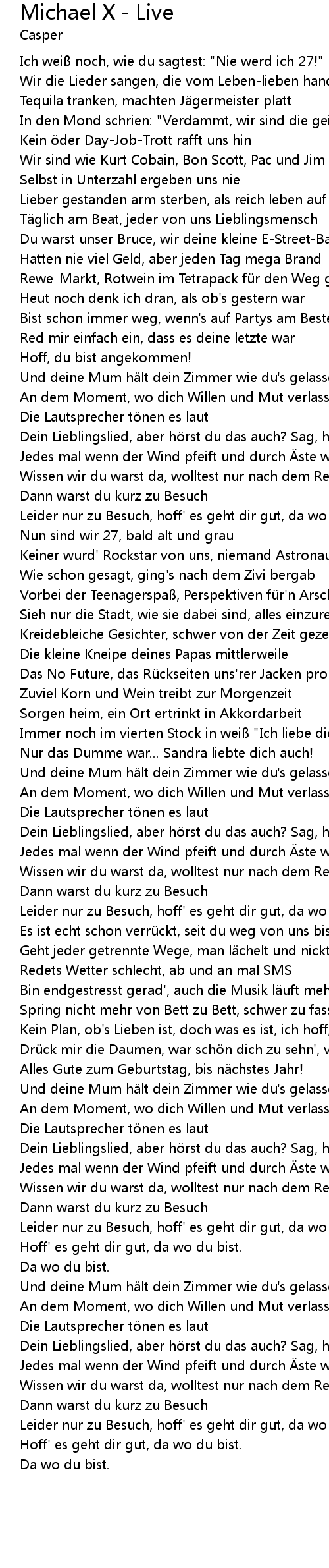 | Und deine Mum hält dein Zimmer wie du's gelassen hast | |