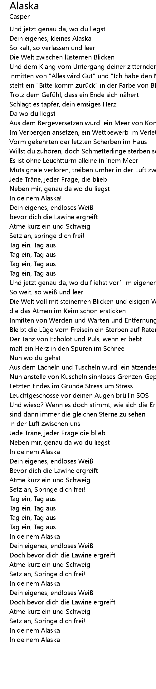 | Und jetzt genau da, wo du fliehst vor’m eigenen kleinen Alaska | |