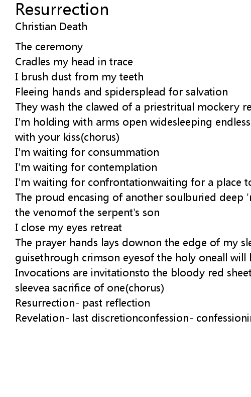 The prayer hands lays downon the edge of my sleepsister death in lepers's guisethrough crimson eyesof the holy oneall will learn to see(chorus) |