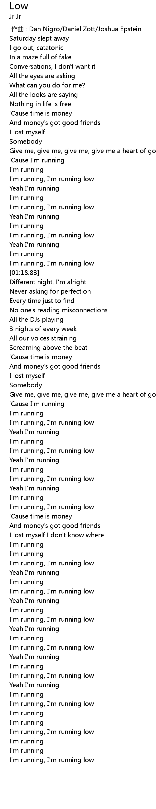 | [01:11.50] | I'm running, I'm running low |