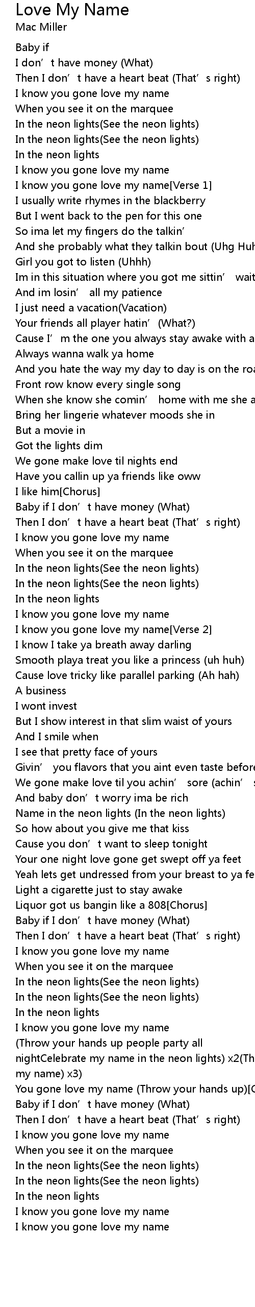 | I know you gone love my name[Bridge](Throw your hands up people party all nightCelebrate my name in the neon lights) x2(Throw your hands up (You gone love my name) x3) | |