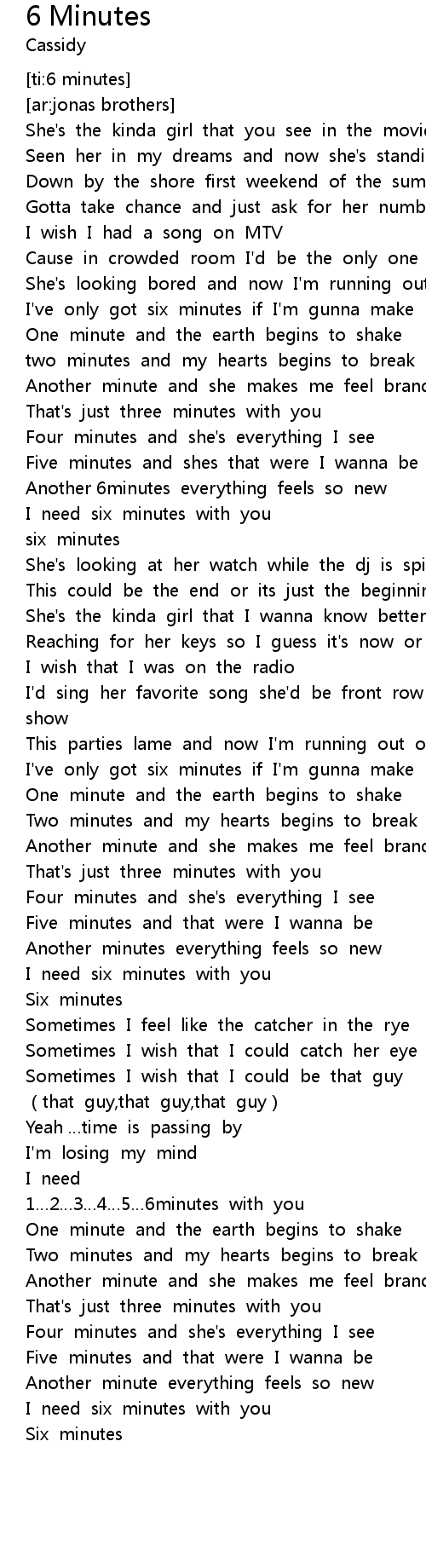 | [00:37.241] | I' ve only got six minutes if I' m gunna make her mine |