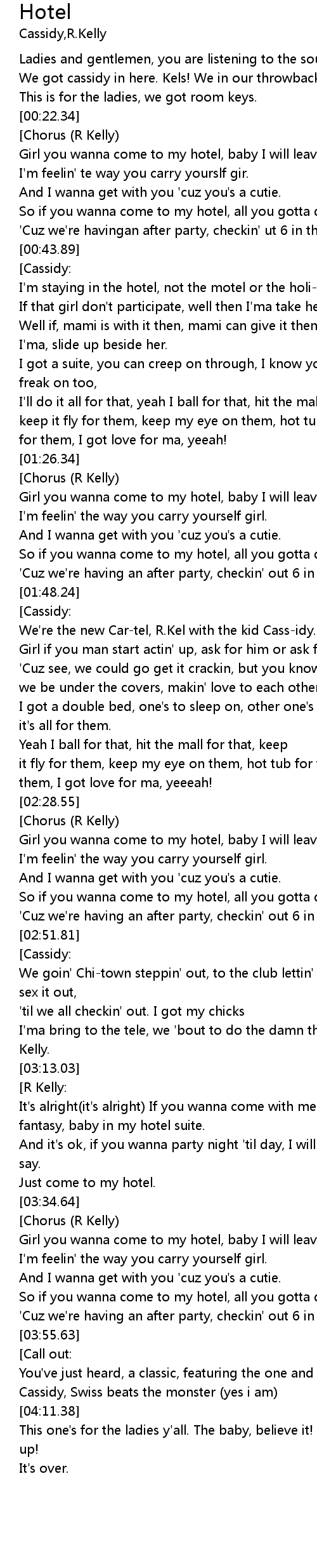 | [00:23.49] | Girl you wanna come to my hotel, baby I will leave you my room key. |