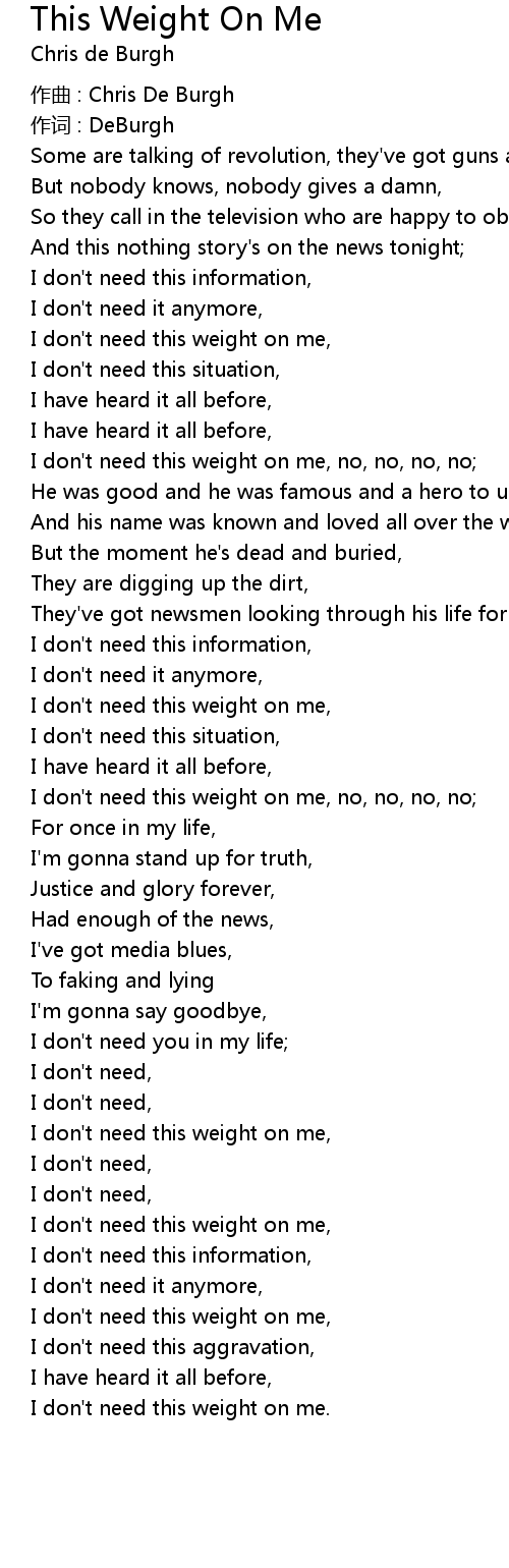 | I don' t need this weight on me, | |