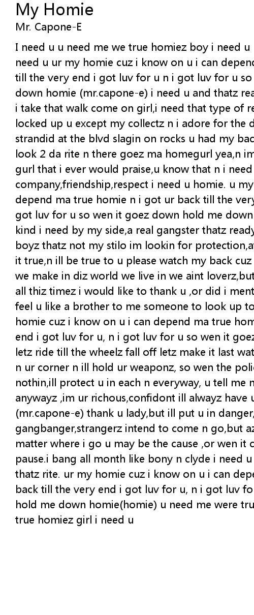 I need u u need me we true homiez boy i need u u need me we true homiez gurl i need u ur my homie cuz i know on u i can depend my true homie and i got ur back till the very end i got luv for u n i got luv for u so wen it goez down hold me down homie (mr.capone-e) i need u and thatz really the talk ur the princess wen i take that walk come on girl,i need that type of respect every time i get locked up u except my collectz n i adore for the dayz wen we at the spot strandid at the blvd slagin on rocks u had my back like an angel on my sholder i look 2 da rite n there goez ma homegurl yea,n im proud 2 say therez no other gurl that i ever would praise,u know that n i need that company,friendship,respect i need u homie. u my homie cuz i know on u i can depend ma true homie n i got ur back till the very end yea i got luv for u n i got luv for u so wen it goez down hold me down homie (ms.pinks) ur dat special kind i need by my side,a real gangster thatz ready to ride im tired of little boyz thatz not my stilo im lookin for protection,affection mijo so please keep it true,n ill be true to u please watch my back cuz ill watch ur back decisionz we make in diz world we live in we aint loverz,but were closer than friendz n all thiz timez i would like to thank u ,or did i mentioni really need u,ireally feel u like a brother to me someone to look up to wen im really in need. ur my homie cuz i know on u i can depend ma true homie n i got ur back till the very end i got luv for u, n i got luv for u so wen it goez down hold me down homie so letz ride till the wheelz fall off letz make it last watever the cause ,im rite n ur corner n ill hold ur weaponz, so wen the police comez they wont find nothin,ill protect u in each n everyway, u tell me not to do it but ill do it anywayz ,im ur richous,confidont ill alwayz have ur back from dusk till dawn (mr.capone-e) thank u lady,but ill put u in danger,thatz a real man from a true gangbanger,strangerz intend to come n go,but az time went by ur loyalty showz,no matter where i go u may be the cause ,or wen it comez to me u put everything on pause.i bang all month like bony n clyde i need u by my side i need u homie thatz rite. ur my homie cuz i know on u i can depend my true homie n i got ur back till the very end i got luv for u, n i got luv for u so wen it goez down hold me down homie(homie) u need me were true homiez boy u i need me u need were true homiez girl i need u |