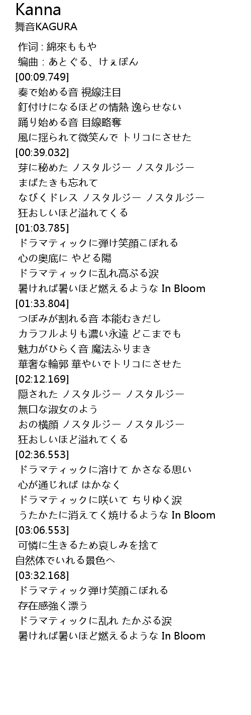 | [02:56.874] | うたかたに消えてく焼けるような In Bloom |