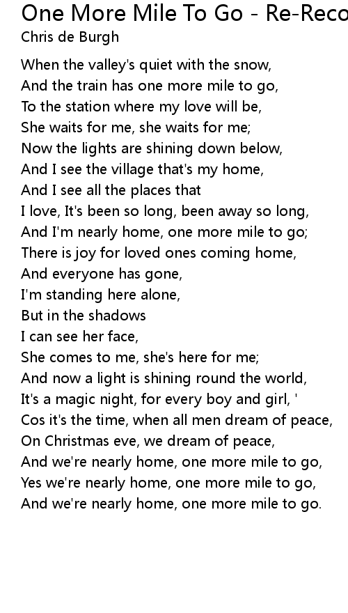 And I'm nearly home, one more mile to go; |