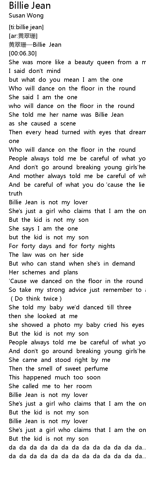 | [00:38.85] | She told me her name was Billie Jean |