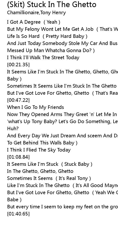 | [00:21.87] | It Seems Like I' m Stuck In The Ghetto, Ghetto, Ghetto Feel That Baby |