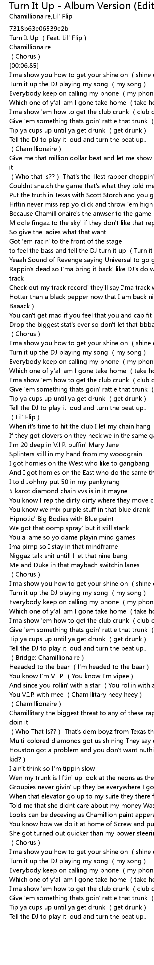 | [00:01.23] | Turn It Up (Feat. Lil' Flip) |