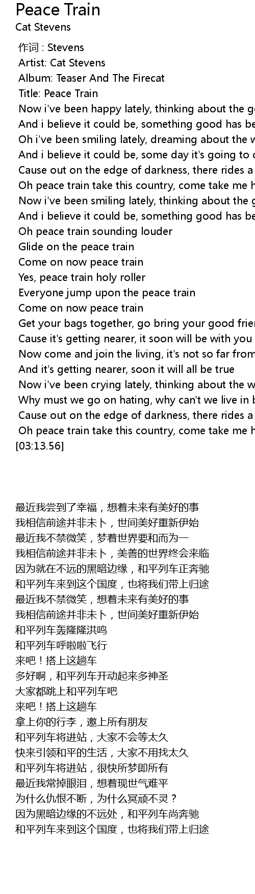 | [02:28.62] | Oh peace train take this country, come take me home again |