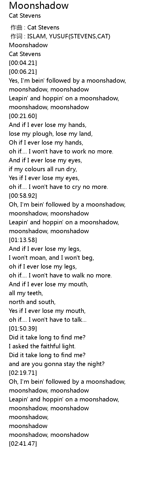| [00:59.97] | Oh, I'm bein' followed by a moonshadow, |