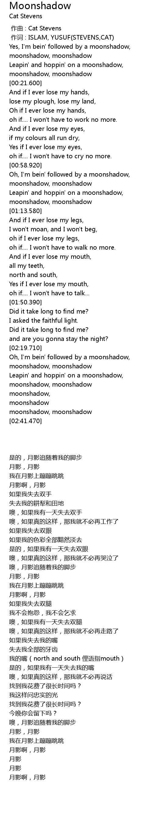 | [00:59.970] | Oh, I'm bein' followed by a moonshadow, |