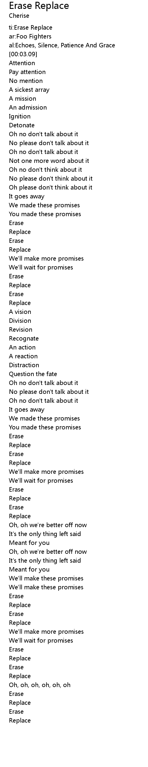 | [00:02.06] | al:Echoes, Silence, Patience And Grace |