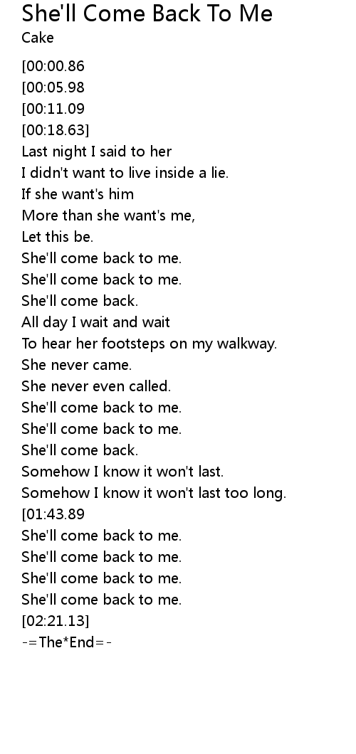| [01:46.37][00:00.86] | -= Cake 《 She'll Come Back To Me 》=- |