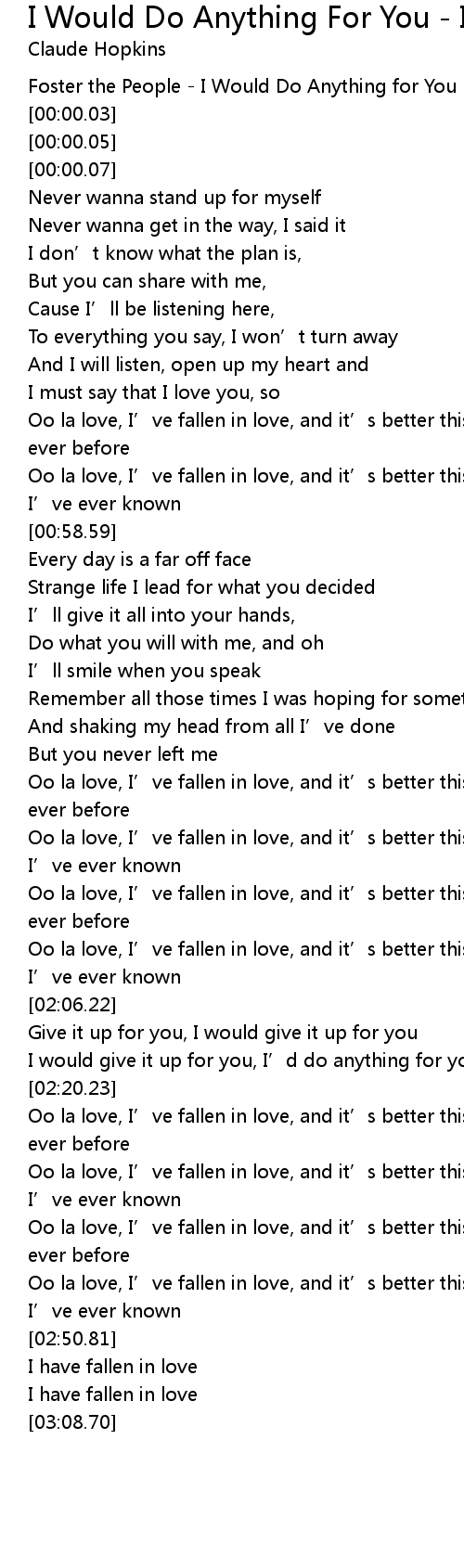| [00:00.01] | Foster the People - I Would Do Anything for You |
