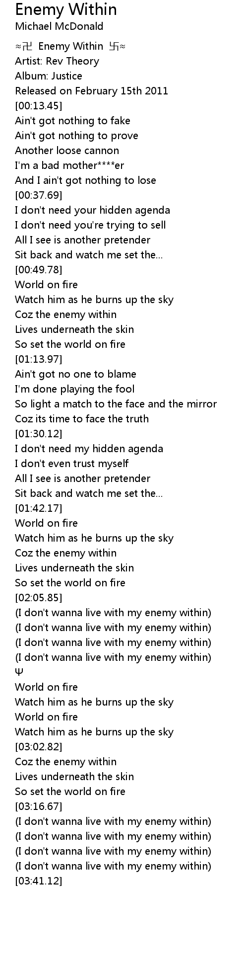 | [02:22.71] | (I don't wanna live with my enemy within) |