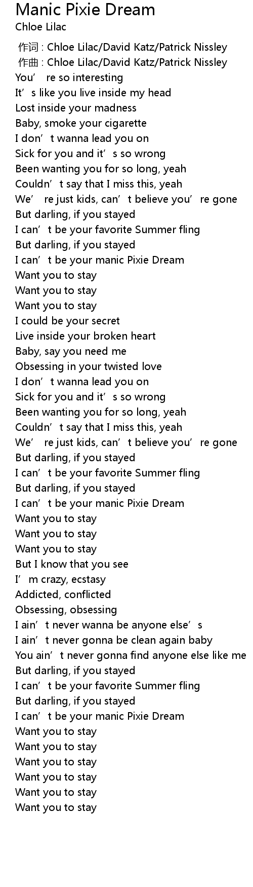 | [03:09.38] | I can' t be your manic Pixie Dream |
