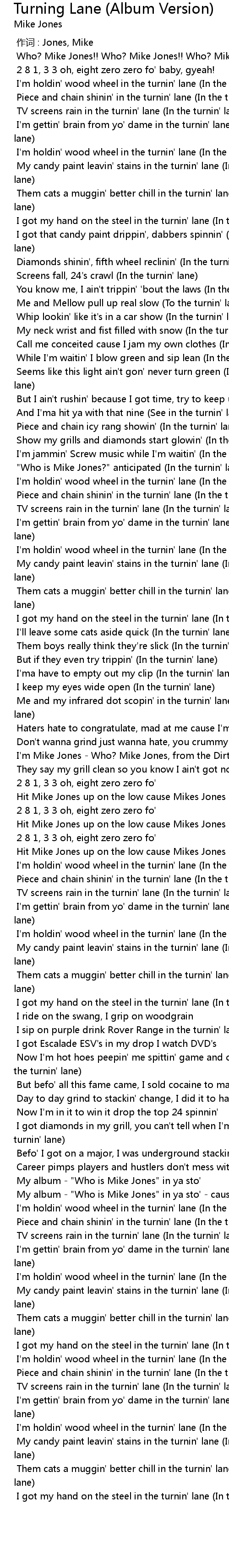 | [03:56.871] | I' m gettin' brain from yo' dame in the turnin' lane In the turnin' lane |