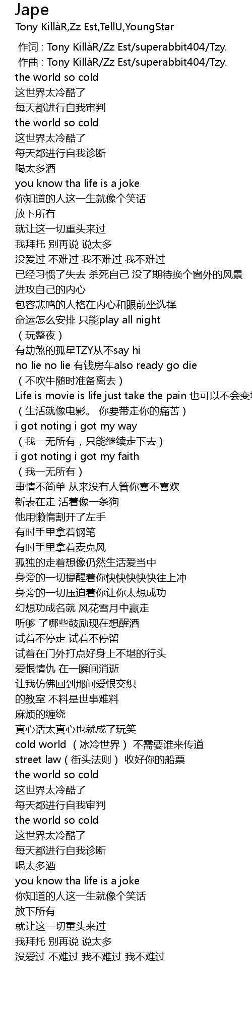 | [00:00.000] | 作词 : Tony KillàR/Zz Est/superabbit404/Tzy. |