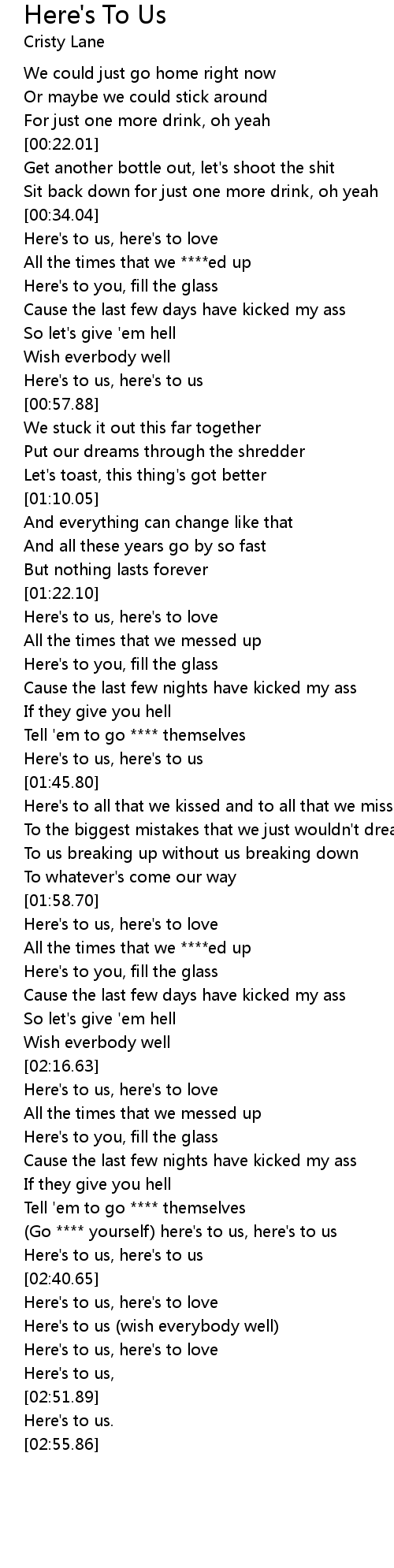 (Go **** yourself) here's to us, here's to us |