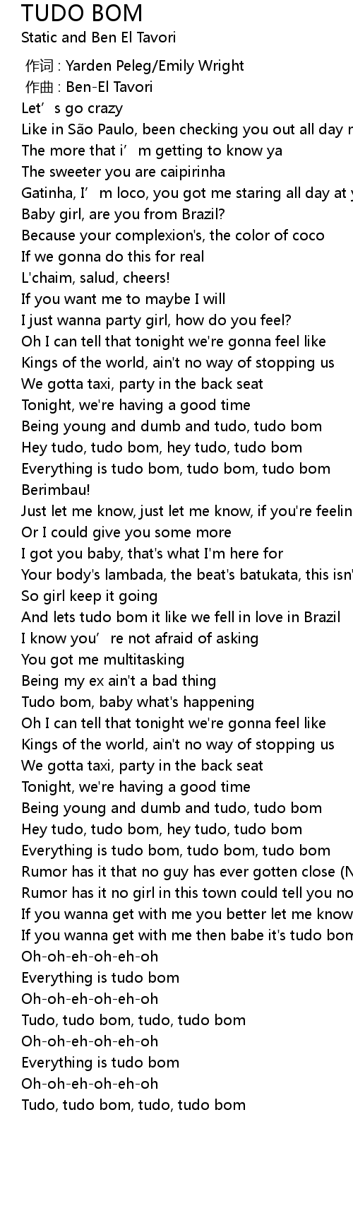| [00:55.94] | Everything is tudo bom, tudo bom, tudo bom |