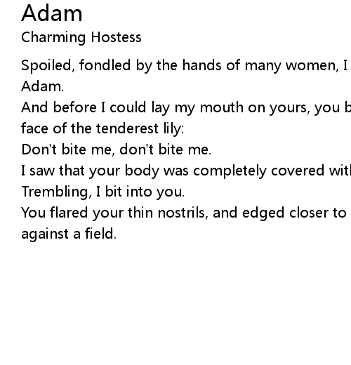| Spoiled, fondled by the hands of many women, I came upon you by chance, young Adam. | |