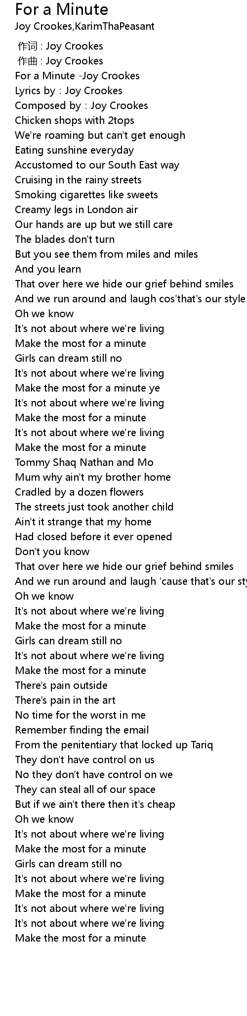 | [00:00.271] | For a Minute -Joy Crookes |