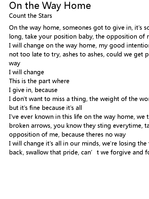 | On the way home, someones got to give in, it's so useless, to drag it out this long, take your position baby, the opposition of me, because there's no way | |