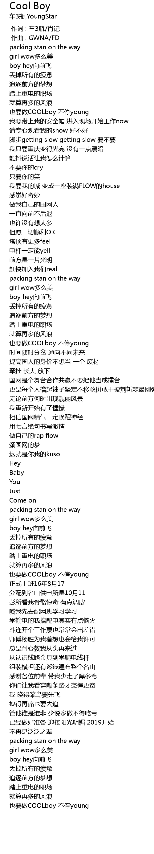 | [00:40.419] | yě yào zuò COOLboy bù tíng young |