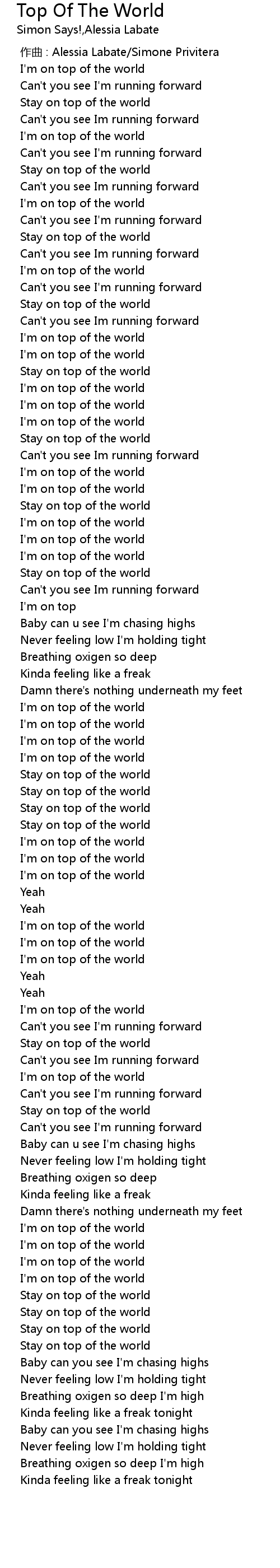 | [00:43.401] | I'm on top of the world |