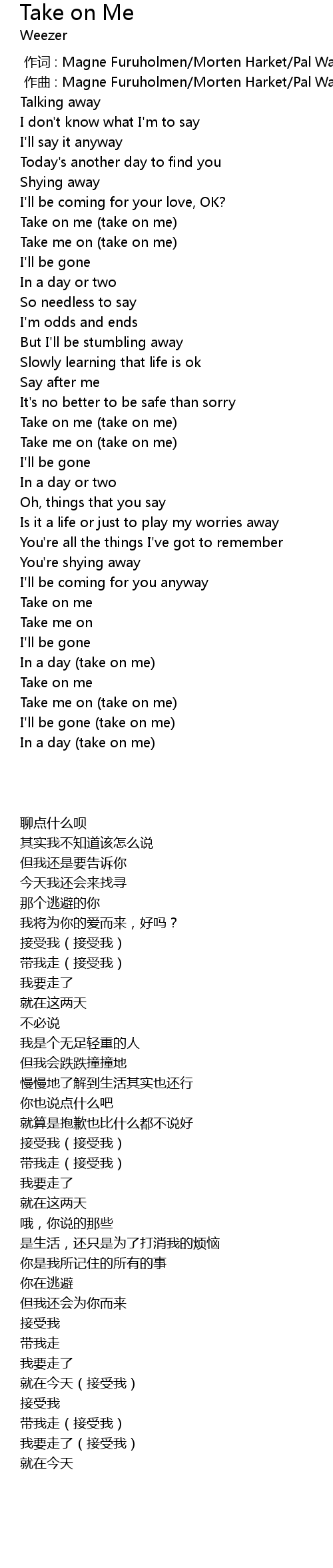 | [03:15.28] | Take me on (take on me) |