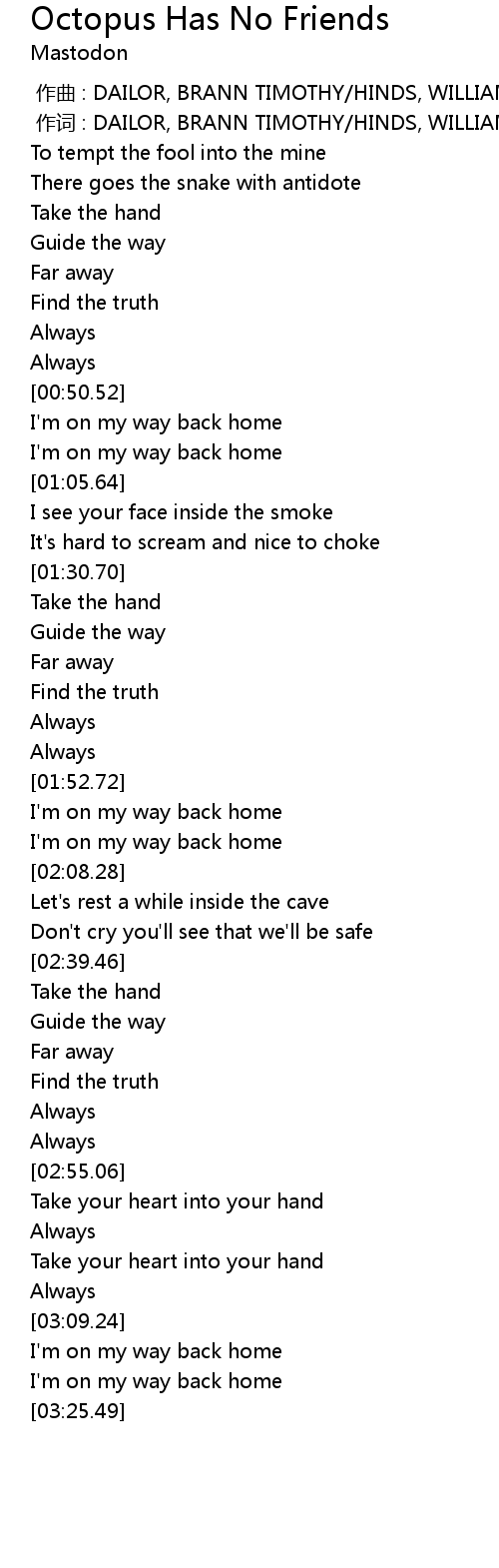 | [00:01.00] | 作词 : DAILOR, BRANN TIMOTHY/HINDS, WILLIAM B |