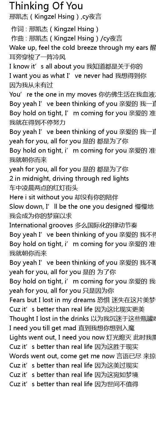 | [01:41.692] | Boy yeah I' ve been thinking of you qīn ài de wǒ bù tíng de xiǎng qǐ nǐ |