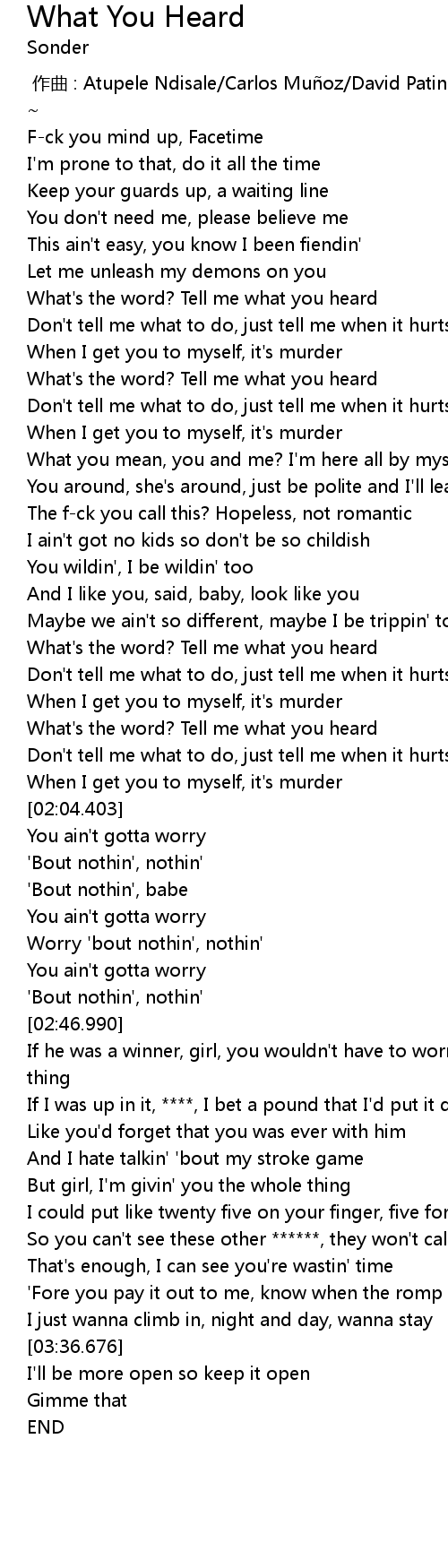 | [01:37.743] | What' s the word? Tell me what you heard |
