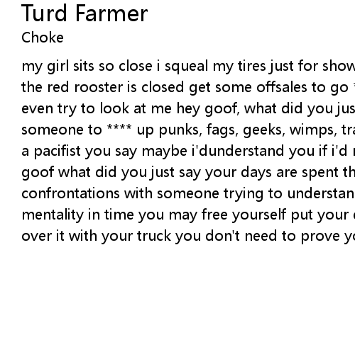 my girl sits so close i squeal my tires just for show and cruise the strip until the red rooster is closed get some offsales to go **** shit up hey, don't you even try to look at me hey goof, what did you just say hop in my truck find someone to **** up punks, fags, geeks, wimps, traveling frak show in a motorhome a pacifist you say maybe i'dunderstand you if i'd made it through grade 8 hey goof what did you just say your days are spent thinking of ways to create confrontations with someone trying to understand just can't comprehend your turd mentality in time you may free yourself put your dickmode in a bucket and run over it with your truck you don't need to prove yourself to me i know better |