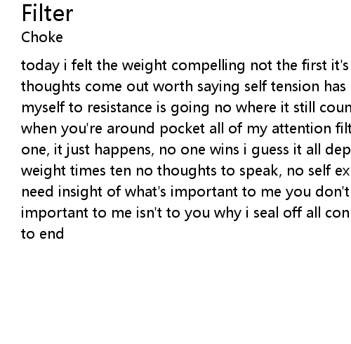 today i felt the weight compelling not the first it's not the best i've been no thoughts come out worth saying self tension has limited what am i committing myself to resistance is going no where it still counts to you more than anything when you're around pocket all of my attention filter out you fault touches no one, it just happens, no one wins i guess it all depends tomorrow i'll feel the weight times ten no thoughts to speak, no self expression complacency is all i need insight of what's important to me you don't know me, just pretend to important to me isn't to you why i seal off all connections self tension has got to end |