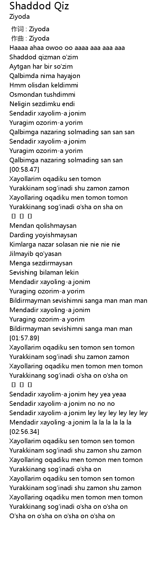 | [00:00.000] | zuò cí : Ziyoda |