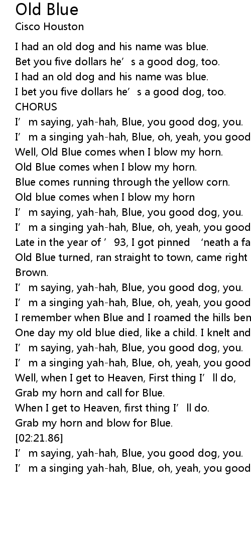 | [02:31.73] | I’m a singing yah-hah, Blue, oh, yeah, you good dog, you. |